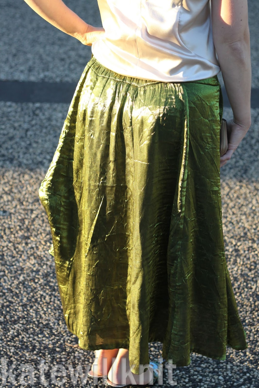 The fabric choice for this skirt will make a huge difference in what you end up with. Using the shimmer crush, I have a rather dressy skirt (I'm wearing it for a Mum's night out Friday - can't wait). But make it in a light cotton, and you have a lovely summer skirt. It looks especially wonderful in a border print. If you're after saving a little fabric, I'd also recommend using a fabric that isn't directional. Because the fabric was shot, I didn't want to risk the gores looking a little off, so all the pieces have been cut the same way. But you can nest the pattern pieces a lot more efficiently if you rotate some of them.